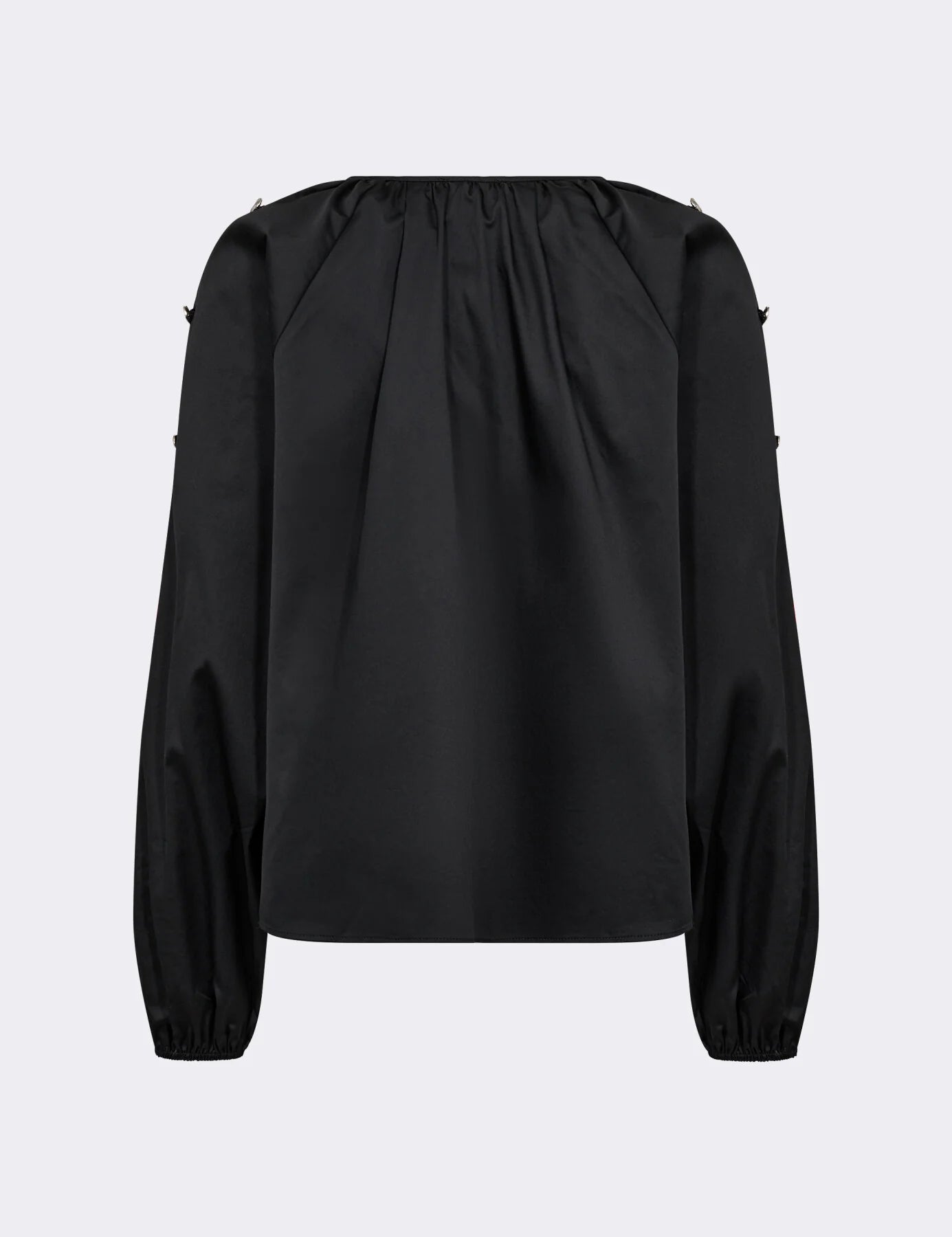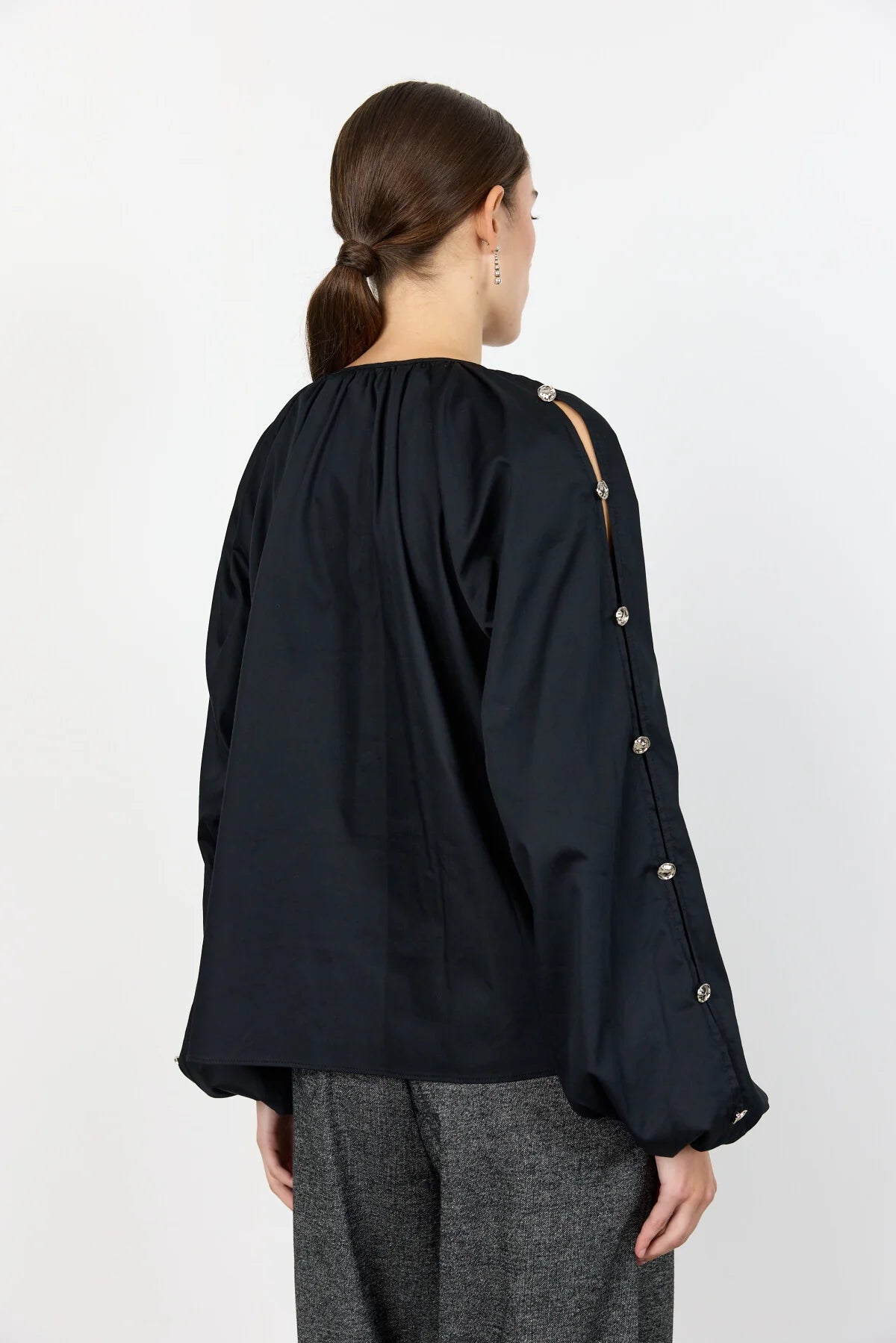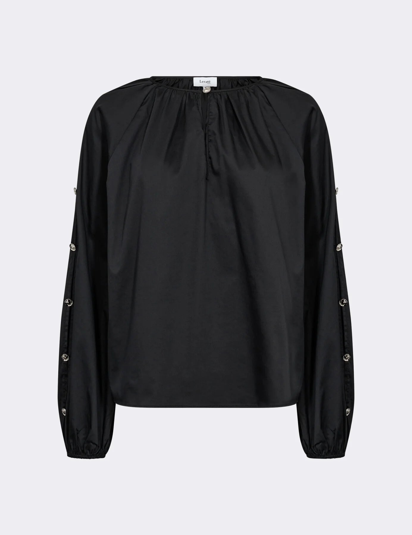 En krispig svart blus. Blusen har eleganta silvriga knappdetaljer längs de långa ärmarna och har en rund halsringning med subtila veck. Matcha den enkelt med skräddarsydda byxor eller en elegant kjol för en elegant look.