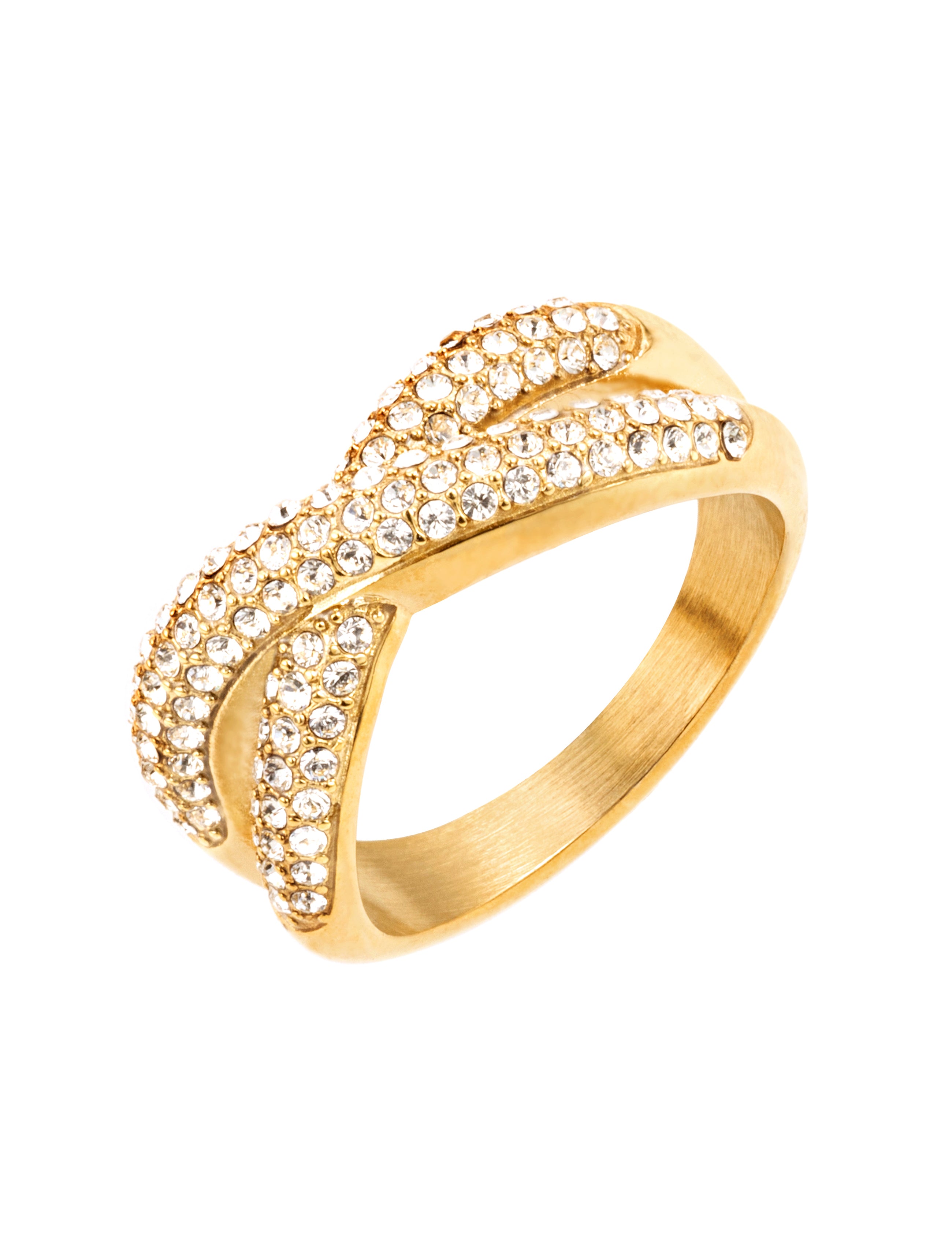 Denna stilrena cross ring kombinerar modern design med tidlös symbolik. Den korslagda formen skapar ett mjukt men uttrycksfullt intryck, där två band möts i perfekt harmoni. Ringen är vackert dekorerad med glittrande stenar som fångar ljuset från varje vinkel och ger en exklusiv känsla. Den öppna, korsade designen gör ringen både bekväm att bära och enkel att matcha med andra smycken – lika perfekt till vardags som till fest. Ett sofistikerat val för dig som vill addera en touch av glamour till din stil, eller som en uppskattad gåva till någon speciell.