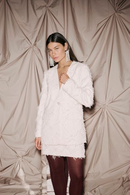 En fin beige kjol med snygga detaljer runt kjolen. Det finns en kavaj som matchar vilket gör det till ett snyggt set.