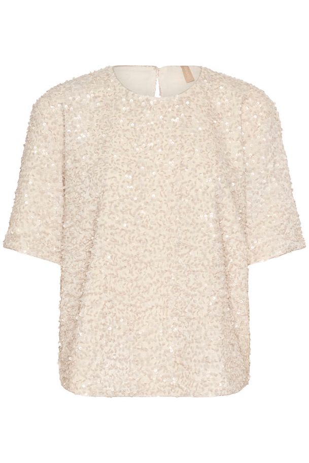 En snygg paljett topp i en vit/beige färg. Den har korta ärmar samt Knäppe i nacken. Toppen har en matchande kjol.