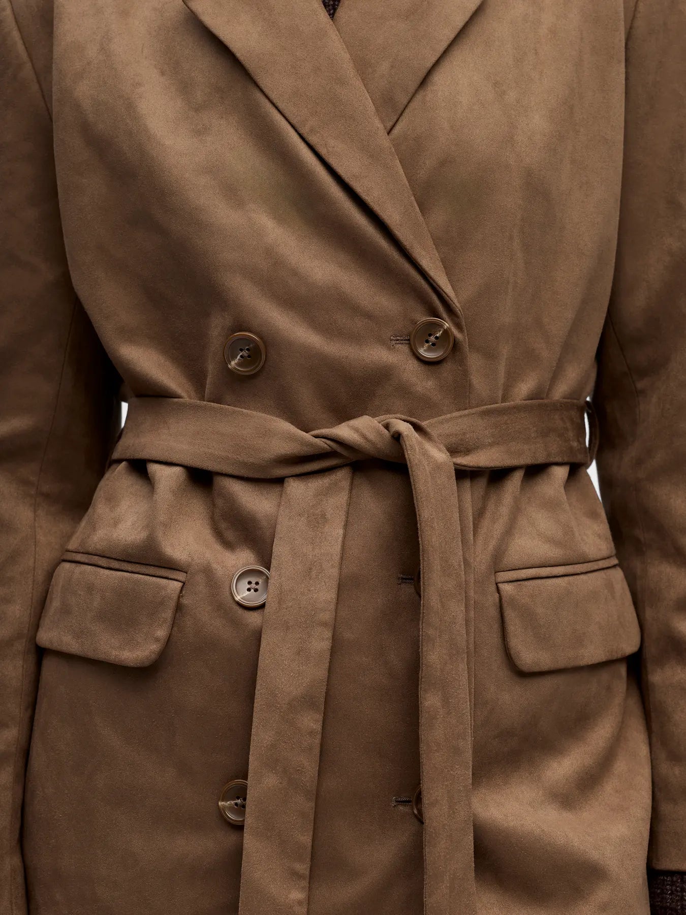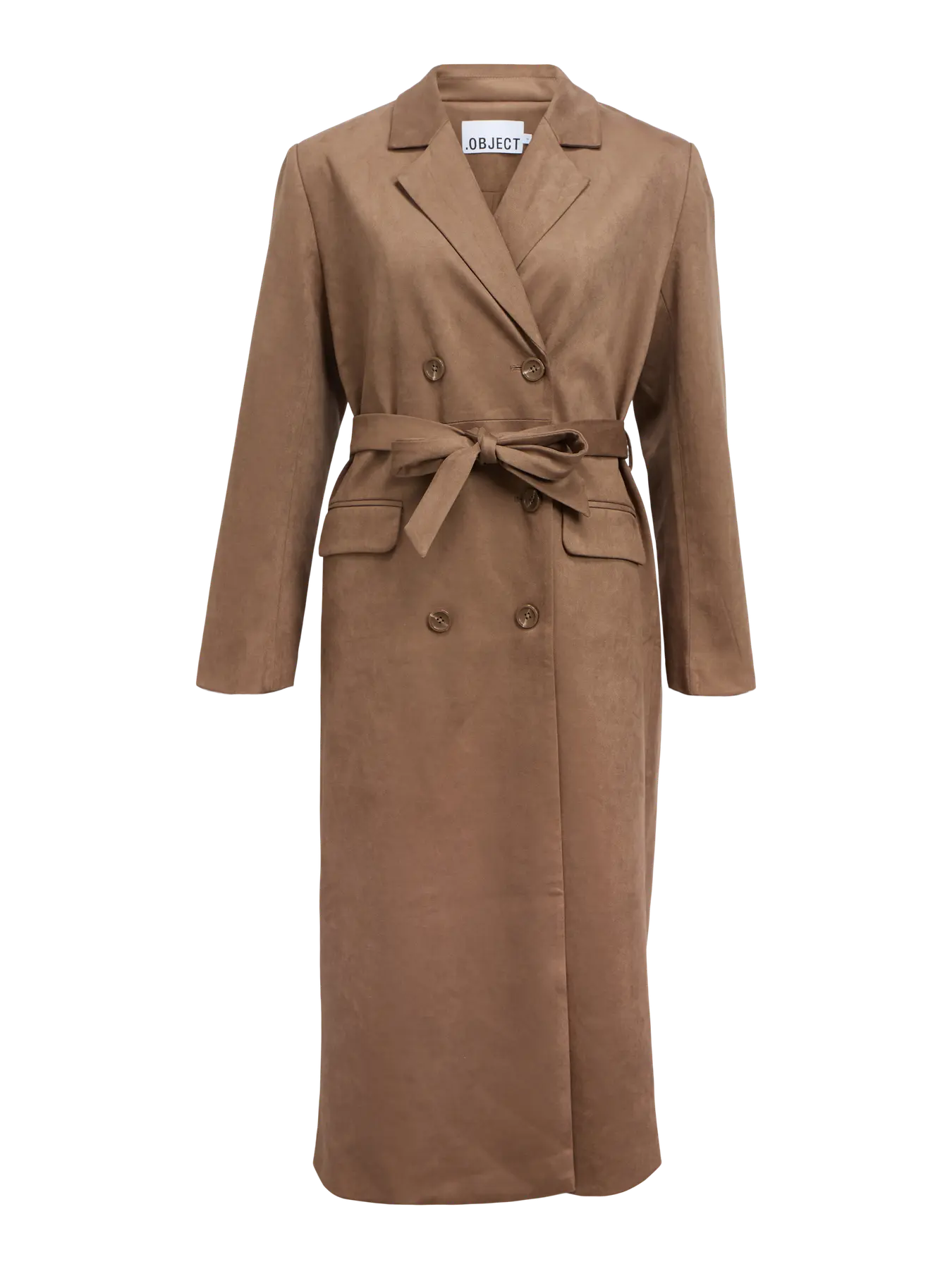 En snygg lång kappa i mocka. Kappan är en klassisk modell med dubbelknäppning och ett bälte i midjan. V-halsad och en snygg krage.