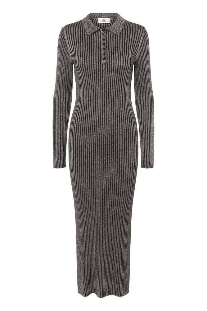 En fin glittrig långklänning med en skjortkrage samt långa ärmar.