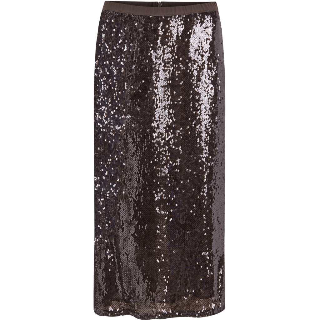 En snygg brun ankel lång kjol med paljetter. En rak modell, slits baktill, resår i midjan och dragkedja. Snyggt till både en stickad tröja eller en festlig blus. Kjolen finns både i svart och brunt.