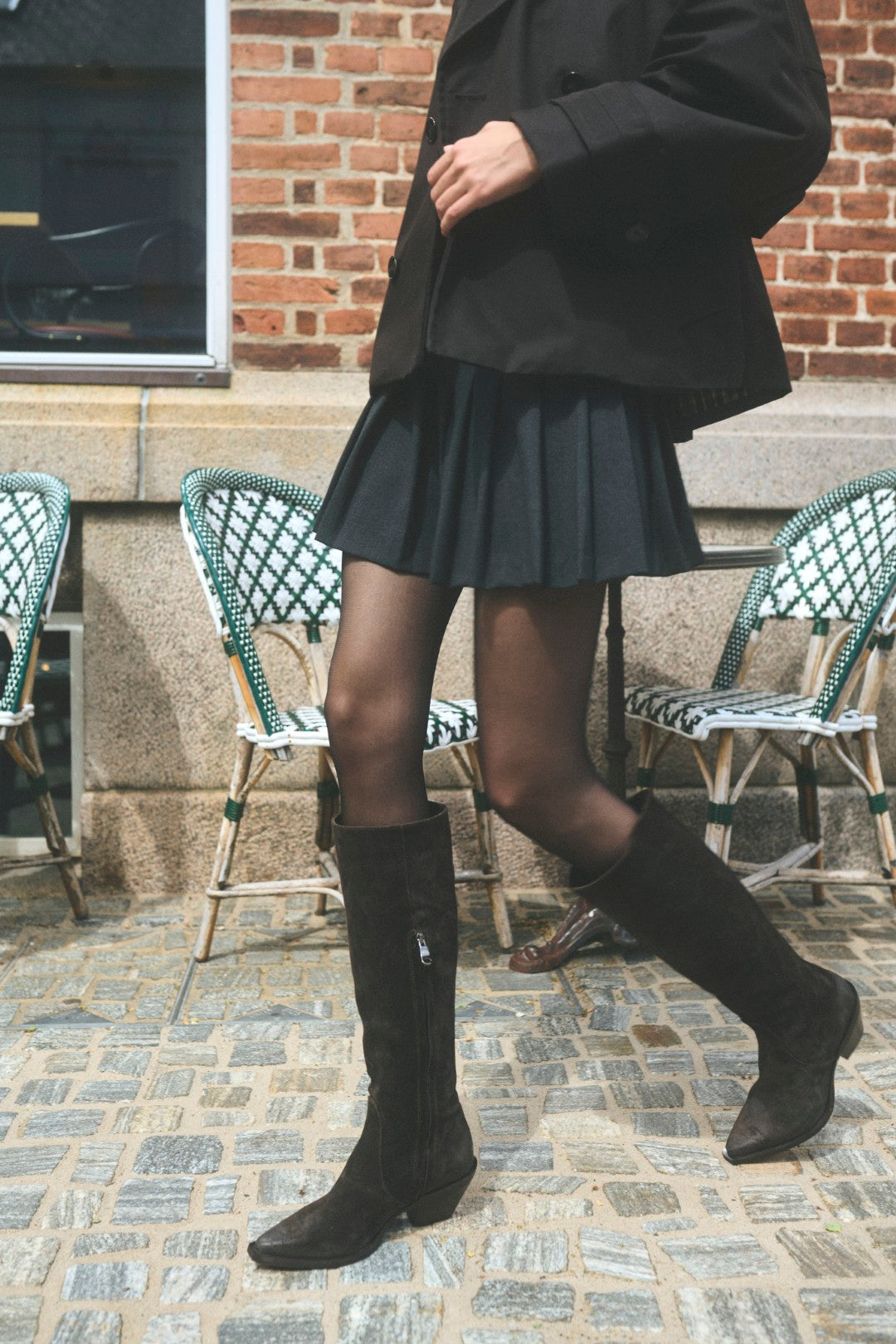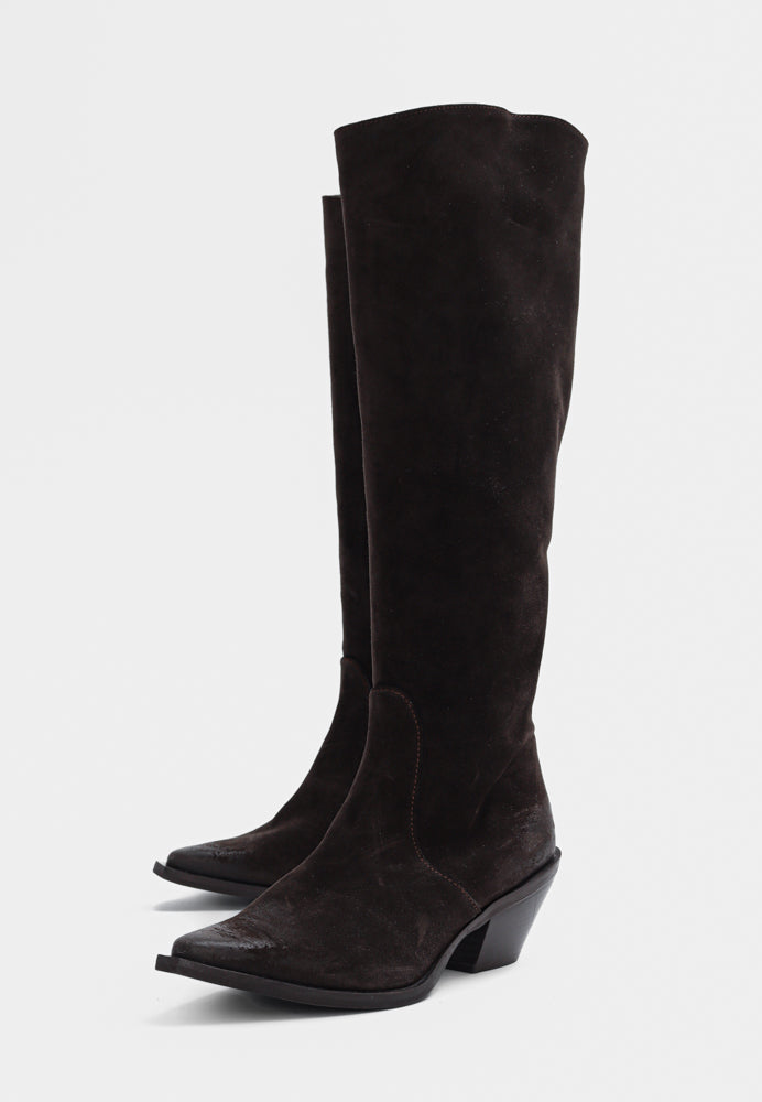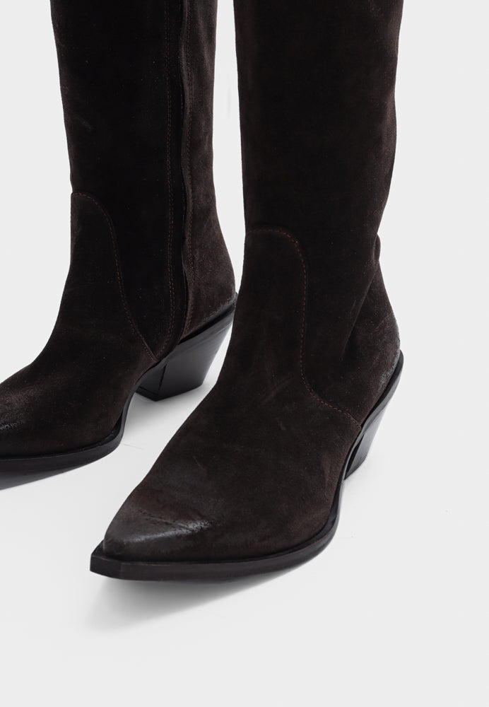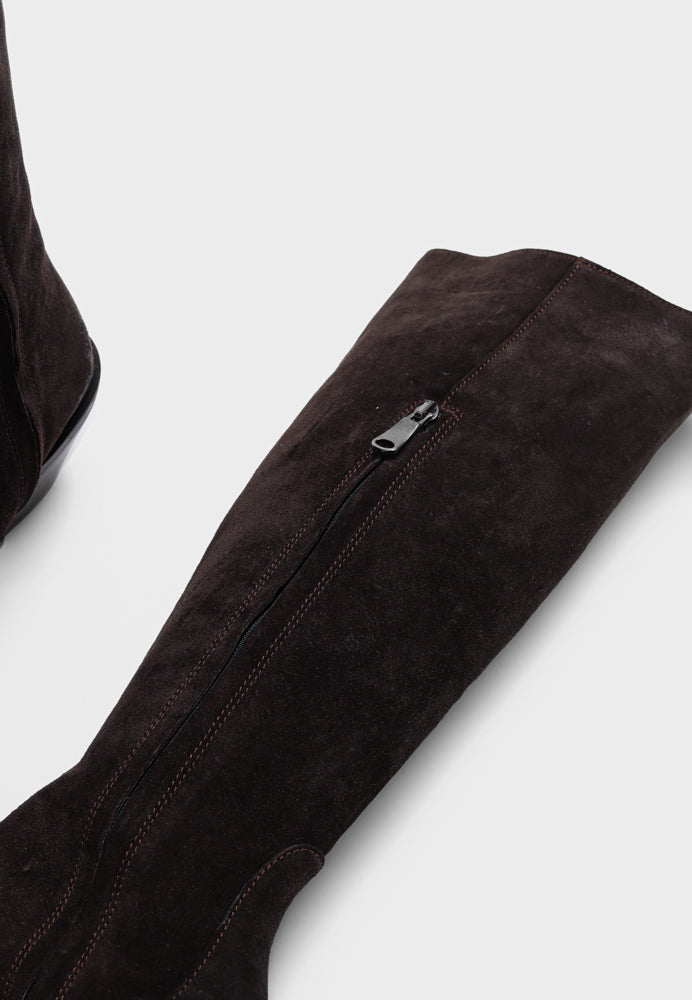 En otroligt läcker brun mocka stövel med spetsig tå och dragkedja på insidan. Stöveln har en bred klack.