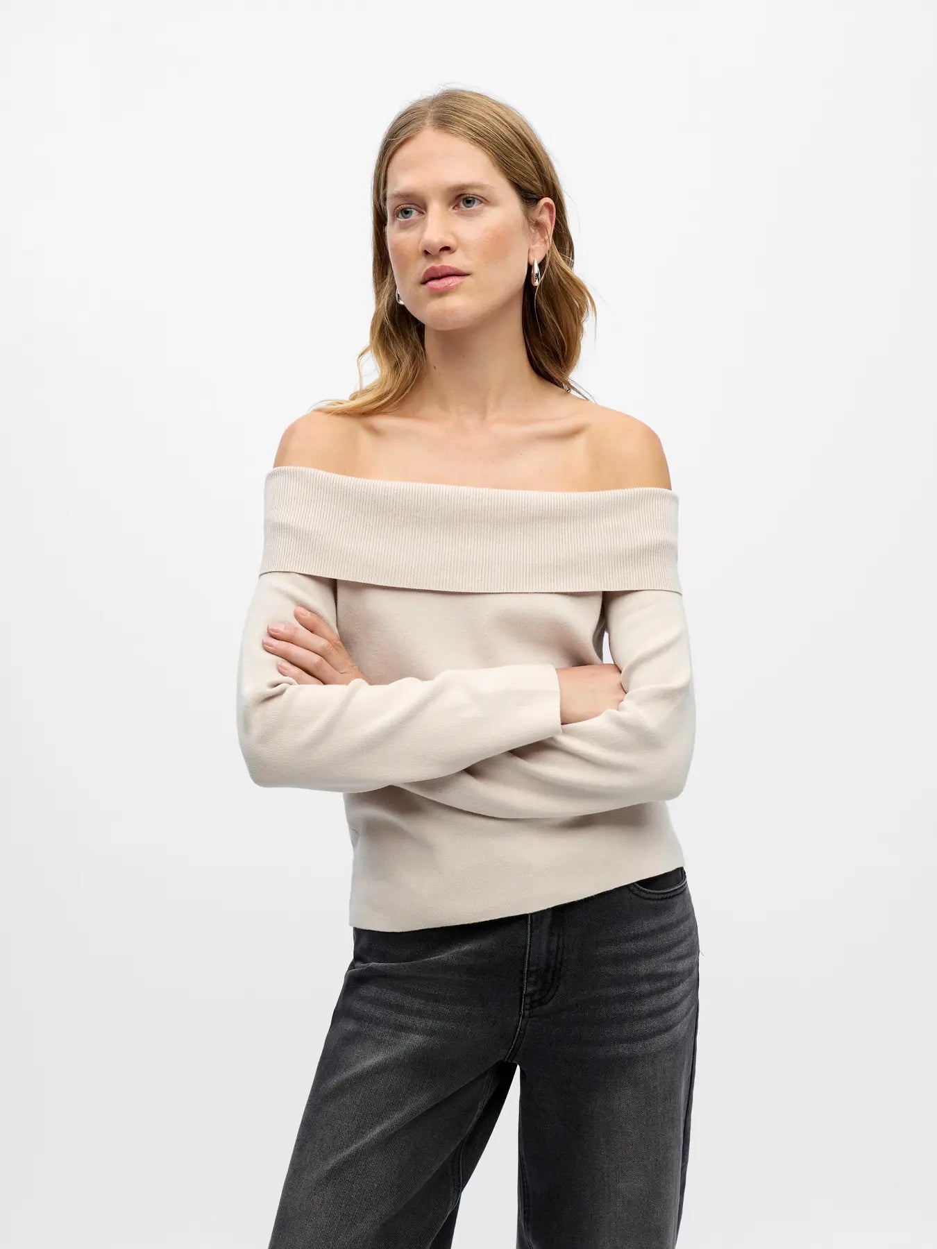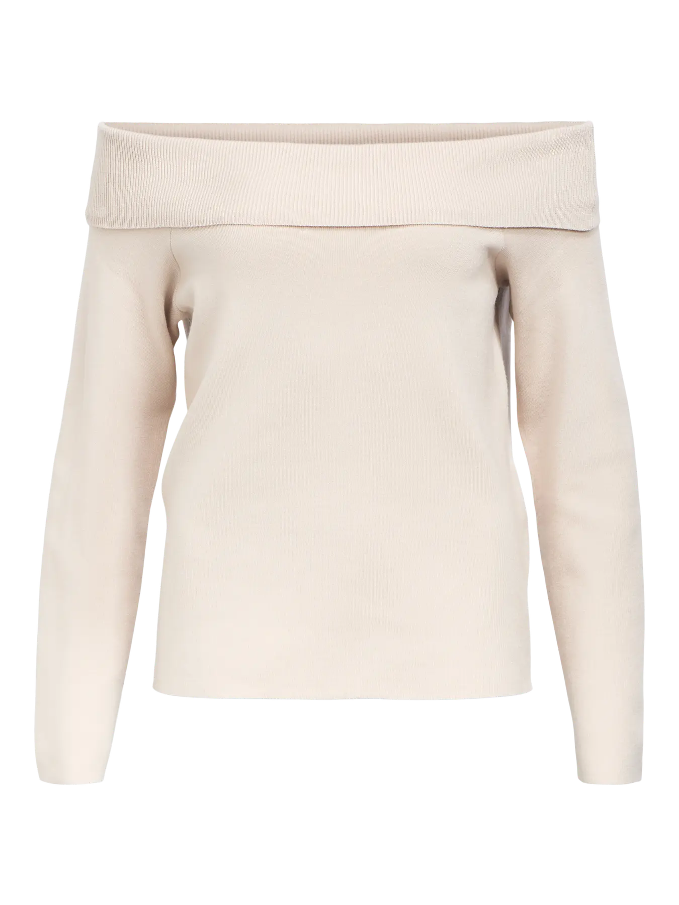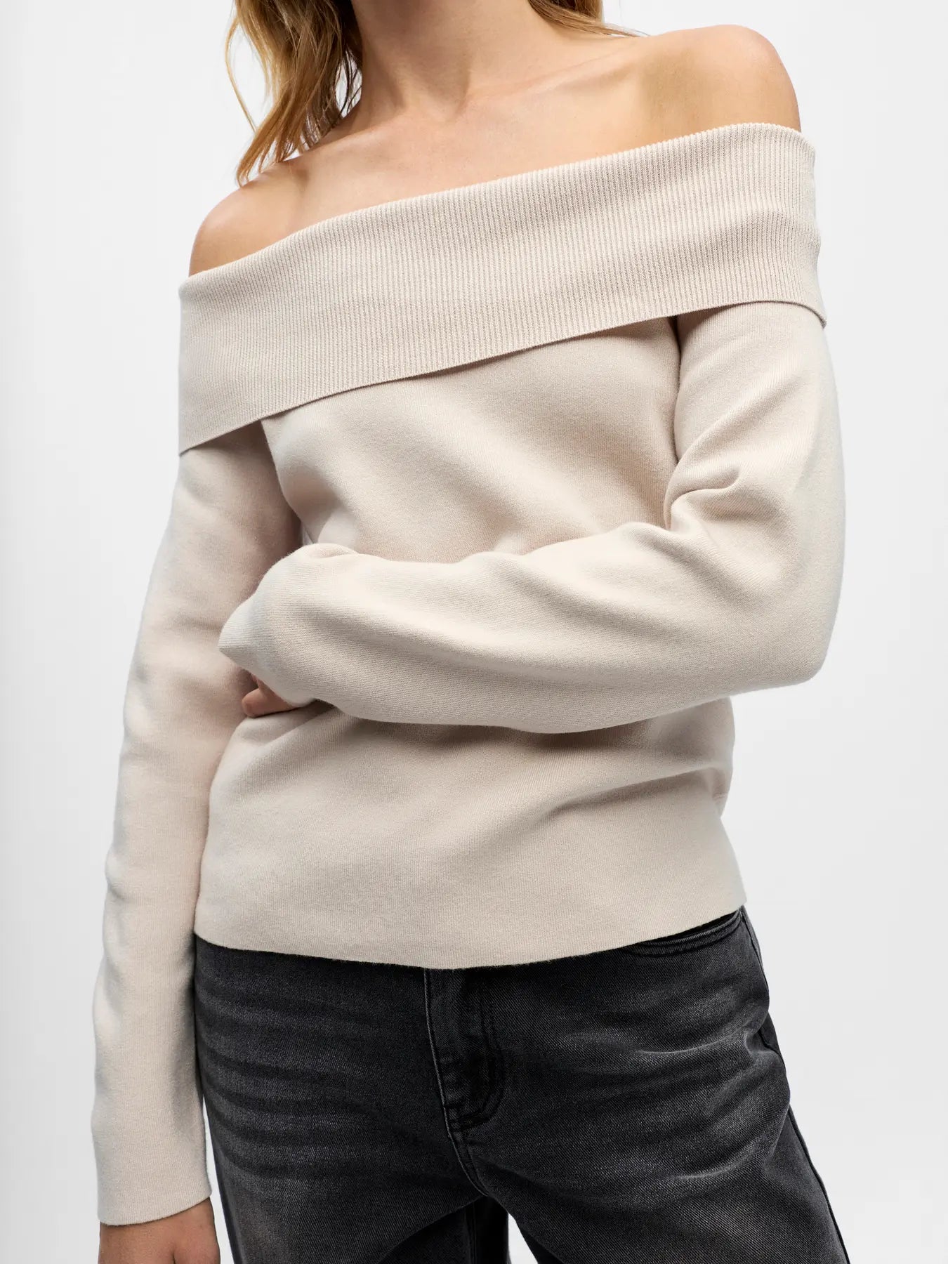 En sngg beige tröja med off shoulder detalj. Tröjan har en lös passform, långa ärmar och en ribbad off shoulder detalj upptill.