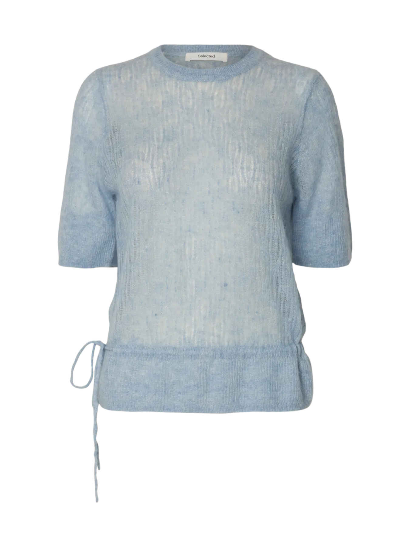 En fin ljusblå stickad tröja med fin struktur i stickningen. Tröjan har en rund halsringning, 2/4 längd på ärmen och en fin detalj med insydd snöre i midjan som du själv kan justera.