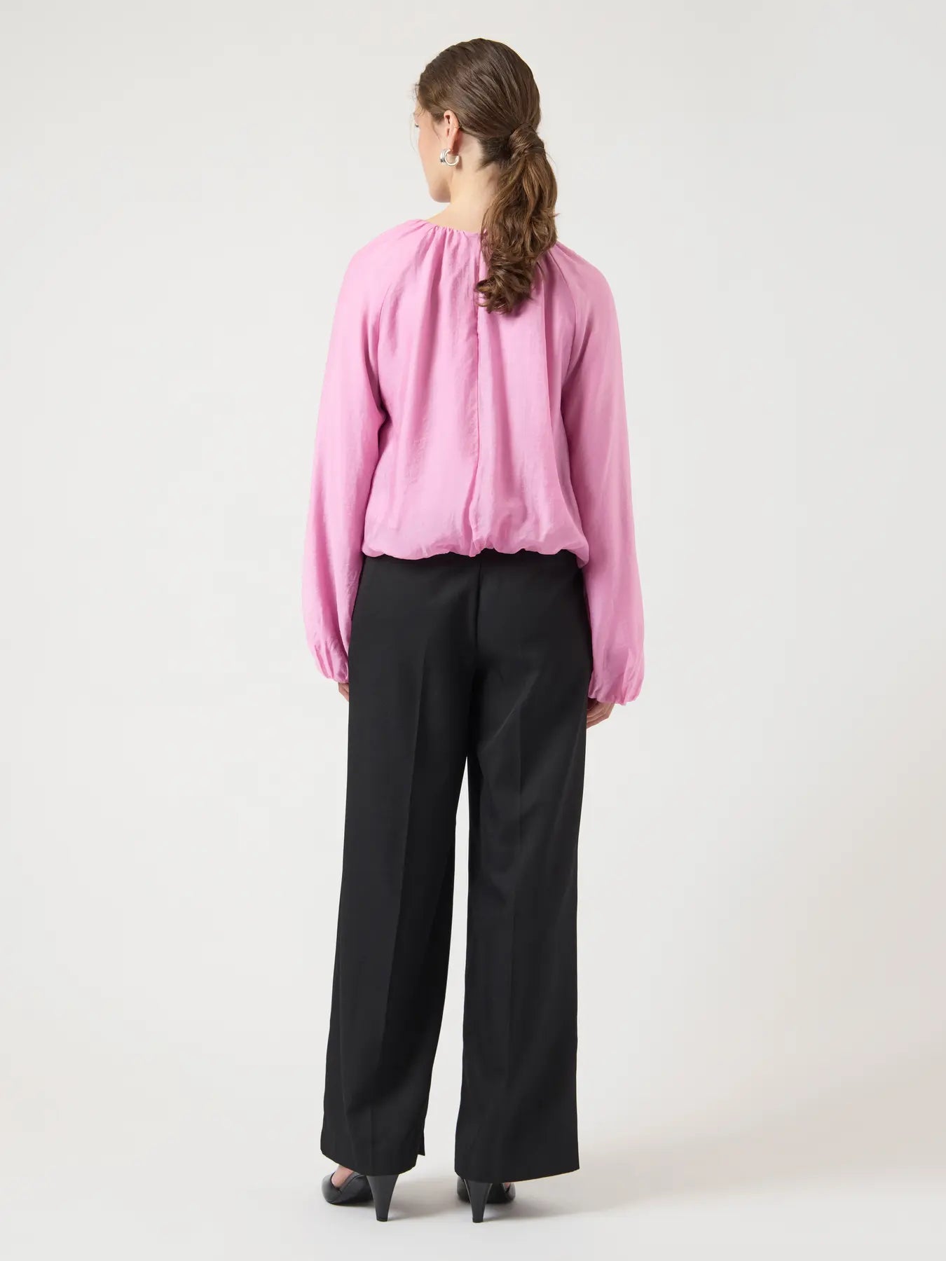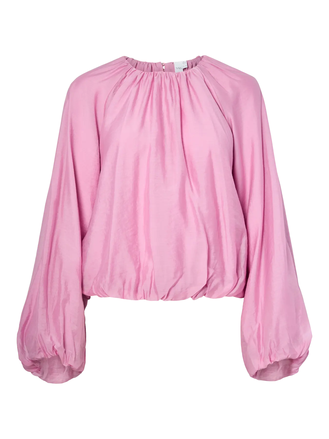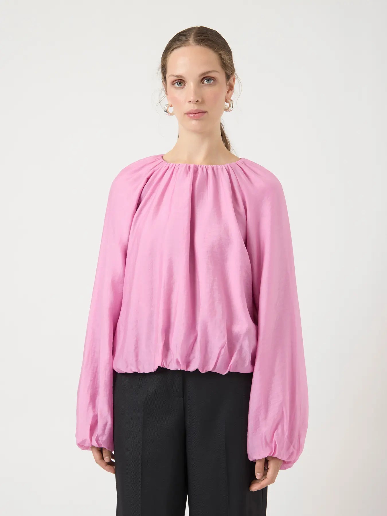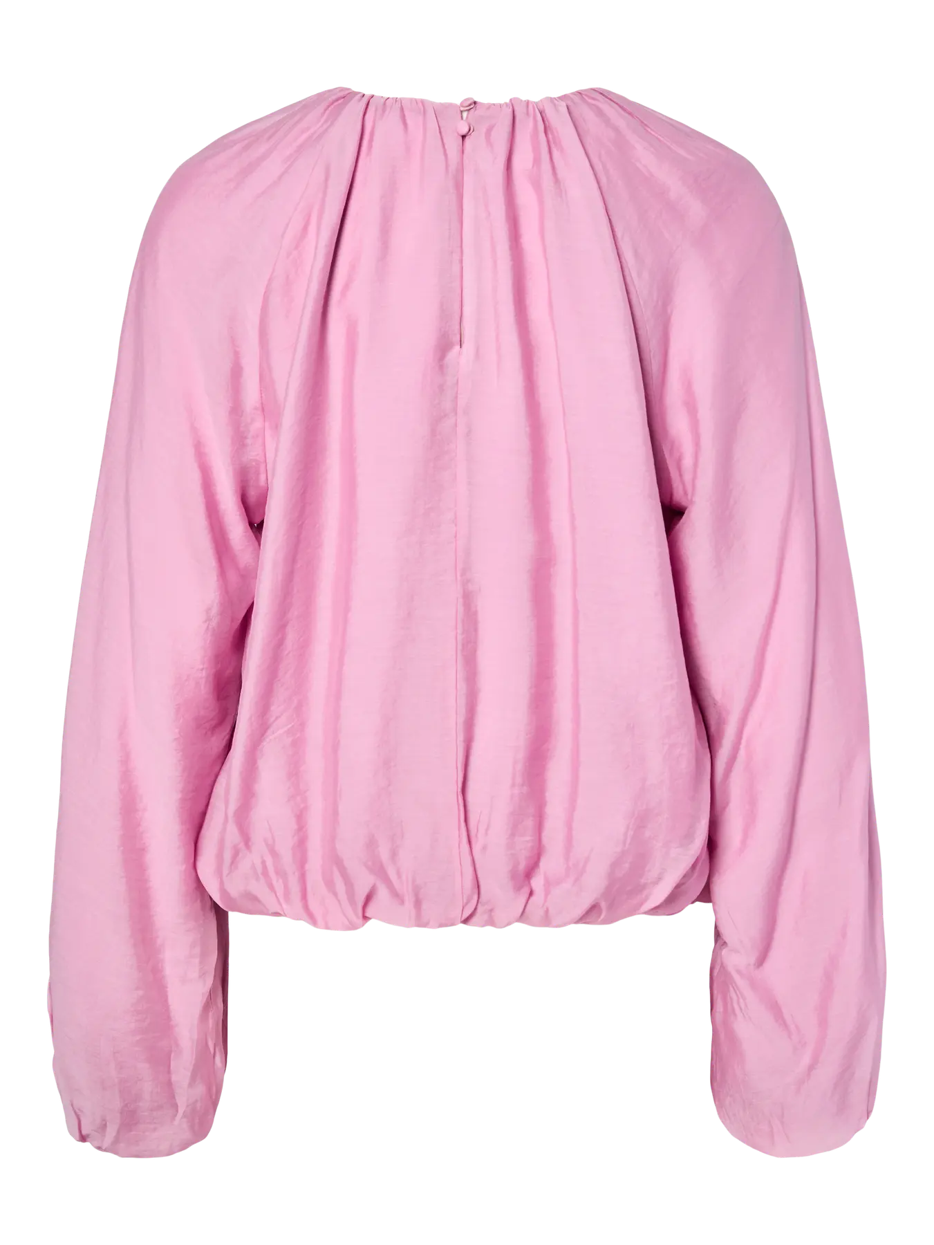 En snygg blus i rosa med ballongärmar. Blusen har en rund halsringning, långa ärmar och elastiska slut både i ärmarna och längst ner på blusen.