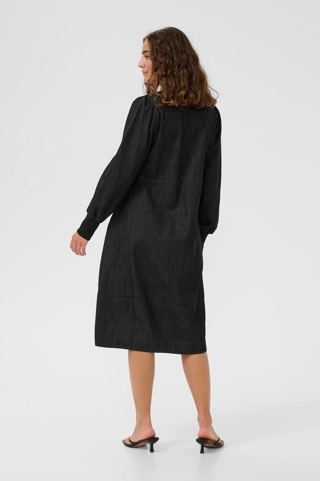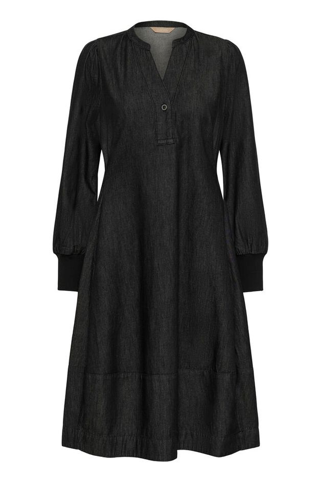 En snygg jeansklänning i svart jeansfärg. Klänningen har v-hals, smock på ärmarna och en lätt markering i midjan. Finns även fickor på sidorna.